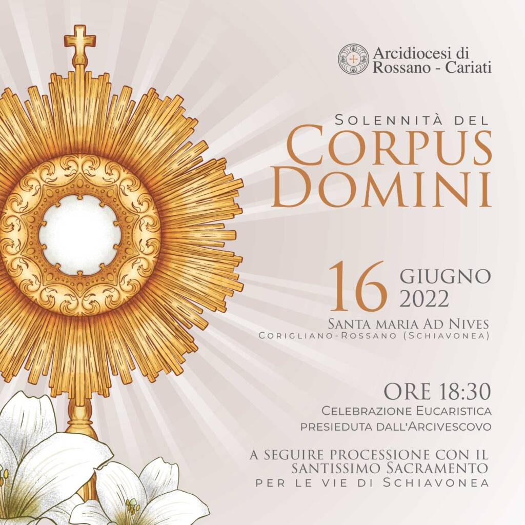 Giovedì 16 giungo si celebra la solennità del Corpus Domini a livello diocesano. La Santa Messa, presieduta da S. E. l’Arcivescovo Mons. Maurizio Aloise, si terrà alle ore 18:30 nella parrocchia di Santa Maria ad Nives a Schiavonea e a seguire ci sarà la processione diocesana per le vie del borgo marinaro dell’area urbana di Corigliano. La scelta del luogo non è casuale, ma altamente simbolica. Infatti, in questo periodo, nella Vicaria di Corigliano, è presente una mostra dei miracoli eucaristici, ideata dal Beato Carlo Acutis. Inoltre, negli ultimi tempi, in particolare proprio a Schiavonea, si sono verificati episodi che hanno scosso la comunità locale, toccata da violenza e azioni criminali che rappresentano una ferita aperta per l’animo di ognuno. Schiavonea è un luogo in cui forte è la presenza degli immigrati e bisogna promuovere azioni per contribuire a porre solide basi per una armoniosa convivenza. Per chi prenderà parte alla processione è possibile scaricare dal sito internet della Arcidiocesi di Rossano Cariati www.rossanocariati.it (il link è disponibile anche sulla pagina Facebook sempre della Diocesi) il libretto della preghiera per la animazione della processione eucaristica.