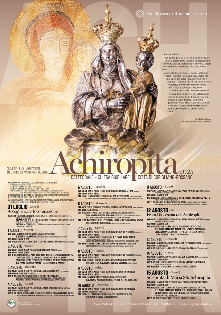 “In questo tempo di grazia, la nostra Cattedrale – Chiesa Giubilare – sottolinea don Pietro Madeo parroco della Cattedrale unitamente ai parroci dell’unità pastorale, si fa casa accogliente per ogni cuore che cerca luce, consolazione e speranza. Celebrare insieme la nostra Celeste Protettrice è occasione per rinnovare la nostra fede e rafforzare i legami di fraternità che ci uniscono come comunità. Vi attendiamo numerosi alle celebrazioni liturgiche, ai momenti di preghiera e alle iniziative in programma, affinché la presenza viva di Maria Achiropita continui a guidare il nostro cammino spirituale e umano. Affidiamoci a Lei con fiducia filiale”.
