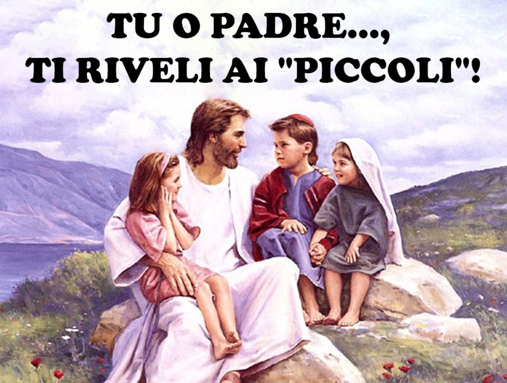 agisci con Mitezza…; Tu, l’Onnipotente, non hai ritenuto un “Tesoro geloso”, l’Essere Dio, ma ti sei Umiliato, fino a “Lavarci i Piedi”…; Sempre rispettoso della nostra Libertà, hai lasciato che, noi Uomini, ti inchiodassimo su una Croce…, e Tu, paradossalmente, hai Pregato per noi, giustificando la nostra Ignoranza (“Padre, perdonali, Non Sanno…!”). È così, che anche la nostra vita, è caratterizzata da molti misteri, che vorremmo ci fossero svelati. Oggi, Gesù, dice compiaciuto al Padre: “Ti rendo lode Padre, Signore del Cielo e della Terra, perché hai nascosto queste cose ai sapienti e ai dotti, e le hai rivelate ai piccoli” (v 25). Ci sia ben chiaro che, dei “segreti” profondi della vita, ne saprà sempre di più la vecchietta, senza alcun titolo di studio, di tanti “saggi e sapienti” (Rabbini e Farisei), Teologi e Professori, che possono anche vantare un curriculum di Studi ineccepibili, e magari presso le più prestigiose Università, ecc., ma il Padre, privileggerà sempre le persone umili, insignificanti agli occhi del mondo, “i piccoli”, gli scartati, che, tuttavia, con la loro semplicità e povertà interiore, sanno mettere a frutto le parole e le azioni di Gesù, riconoscendone l’identità più segreta… e, ahimè, questo vale non solo per l’epoca di Gesù, ma anche per noi oggi. Questo brano, in definitiva, contiene un forte richiamo alla Conversione, rivolto a tutti, ma soprattutto a chi si ritiene di essere detentore di sapienza e assennatezza: Dio dona la sua “Rivelazione”, a chi smette di fare affidamento sulla “propria sapienza”, rivelandosi agli uomini, magari “senza cultura”, senza competenze nelle scienze religiose, che puntualmente, allora come oggi, venivano disprezzati dagli Scribi e dai Farisei, che così commentavano: L’ignorante è un povero peccatore, e l’uomo dei campi non può appartenere a Dio! Ma solo Dio, che vede nel segreto dei cuori, può giudicarci, perché è consolante sapere, che Lui dona, non secondo i meriti, ma secondo le necessità! A Lui, sia ben chiaro, niente resta “nascosto”. A tal proposito, mi piace citare un Proverbio arabo, che dice: Se in una notte nera, una formica nera, sale su un muro nero, Dio la sta osservando! Che bello! Ecco perché preghiamo: “Non guardare Signore, i nostri peccati, ma alla fede della tua Chiesa…!”, cioè: ai Poveri, ai semplici, ai reietti, a quelli che vengono guardati con disprezzo dai (“cosiddetti”) “devoti”, ma che, tuttavia, sanno ascoltare con entusiasmo la tua Parola, ed accogliere con gioia e gratitudine la predicazione del Regno. Pur nella fatica e negli insuccessi, anche Pastorali, non dobbiamo mai scoraggiarci o demordere. Perché la “strategia” del Padre, e la sua logica inattesa, saremo in grado di comprenderla, solo allorquando sapremo “aprire” il nostro Cuore alla Speranza, un Cuore che sceglie di “arrendersi” all’ostinazione, sapendo valutare “il limite” della ragione, spalancandosi così, all’inaudito di Dio. Per questo, oggi, Gesù, ci invita quasi ad “iscriverci” alla sua Scuola: “Venite a me, voi tutti…, e imparate da me…: l’Umiltà e la Mitezza” (v 28), solo così, la “Promozione” a fine Vita, sarà la nostra stessa Salvezza. Se su questa terra (apparentemente), sono gli arroganti a vincere, le persone cosiddette “splendide”, i sani, i senza scrupoli, i saccenti, ecc., nella logica di Dio, invece, comprendono tutto, solo: Gli sconfitti, i perdenti, i miseri…, perché sono capaci di spogliarsi da ogni attesa e da ogni malizia. Ecco perché nelle nostre Parrocchie, l’attenzione agli “Ultimi”, deve caratterizzare ogni nostra scelta Pastorale, e i nostri stessi Movimenti Liturgico- Catechetici. Chiediamo, pertanto, al Signore: “Donaci o Padre, un Cuore umile e confidente, che ci faccia diventare come Bambini. Infatti, è ai “piccoli”, che il Padre si rivela” (CCC n.