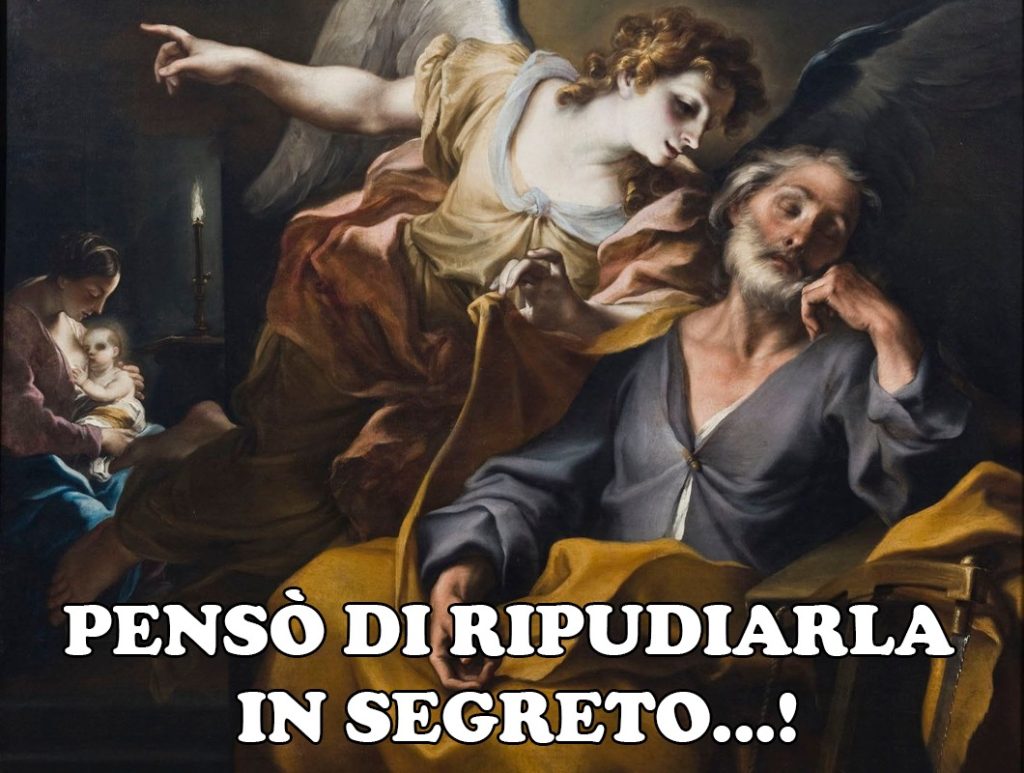 Anche per Giuseppe sta per compiersi la “Promessa” di Dio. Il Signore lo visita nel sonno, quando, cioè, si è privi di ogni forma di difesa! Dio ha un dono per lui, “uomo giusto”, del quale si è potuto fidare, un dono che non è nemmeno volontà di Maria, la sua “promessa sposa”, poiché si trovò incinta, per opera dello Spirito Santo” (v20).