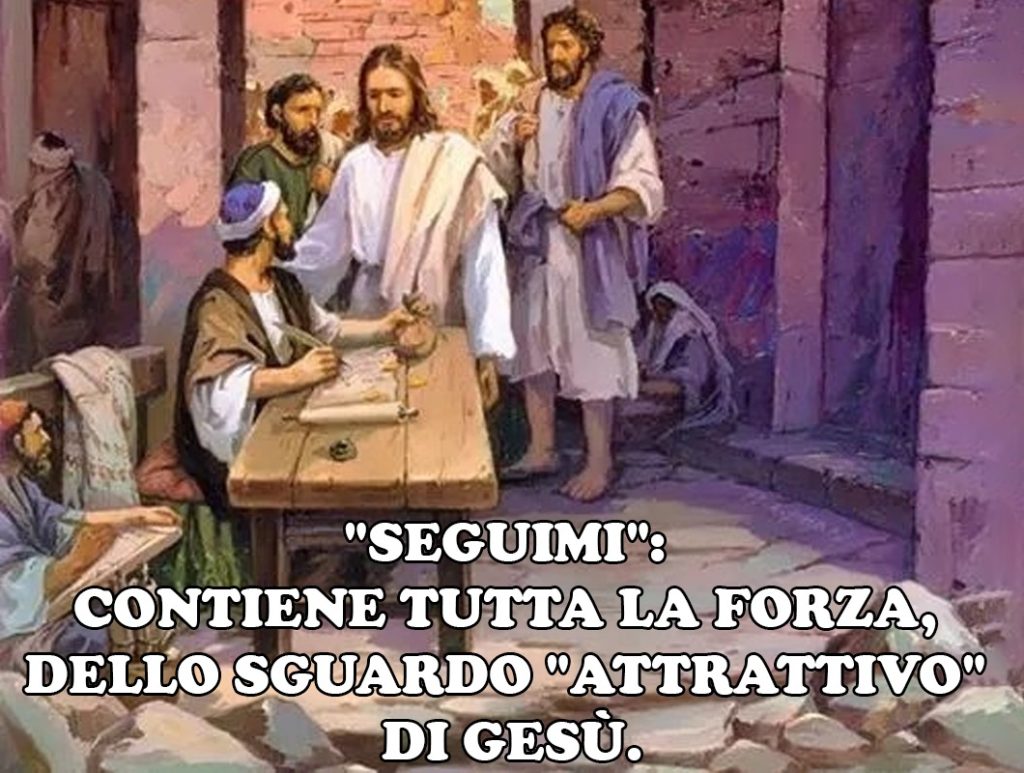 o (“Clèofa”), probabile marito, di quella “Maria di Clèopa”, presente alla Crocifissione, insieme alle altre donne, sorella di Maria, Madre di Gesù. Ora, a prescindere da questi rapporti di presunta parentela con Gesù (Infatti, il termine “fratello”, allora indicava anche una parentela prossima – v Mt 12, 46-50), il suo “alzarsi”, e seguire prontamente Gesù, non solo è indicativo di una sua maturità e serenità personale (Nonostante il “disprezzo”, che gli altri potevano nutrire per la sua professione!), ma ci fa anche comprendere la grande gioia che scaturì nel suo cuore, dopo questo meraviglioso, quanto inaspettato incontro con Gesù. Tant’è, che da lì a poco, per esprimere tutta la sua gratitudine, “organizzò un grande banchetto nella sua casa” (v 15), pur consapevole, che tutto questo, avrebbe suscitato l’ira e la spietata critica degli Scribi e dei Farisei. Ma, vedremo, che sarà Gesù stesso, a risponde alle loro critiche” “Mangia e beve insieme ai pubblicani e ai peccatori!” (v 16b), dicendo loro: “Non sono i sani che hanno bisogno del medico, ma i malati, io non sono venuto a chiamare i giusti, ma i peccatori” (v 17). Possa il Signore, concedere anche a ciascuno di noi, di saperci totalmente affidare a Lui, sempre “attratti” dal suo sguardo d’Amore, perché siamo tutti “bisognosi” delle sue Cure, a causa dei nostri Peccati. Lui, che ben conosce anche il nome di ciascuno di noi, ci chiama tutti ad una Vocazione di Salvezza. Accogliamo, pertanto, questo suo “Invito” – “Seguimi” – con prontezza, sulla stregua di Matteo, per vivere, anche noi, questa sua grande gioia! Auguro a tutti di cuore, di trascorrere una serena e