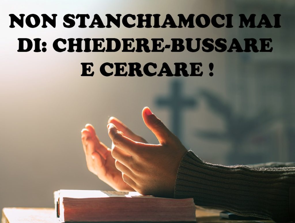 Sant’Agostino ci insegna, che la Preghiera e la Fede, sono le “Ali” della Carità! Gesù, in questo Tempo di Quaresima, ce ne indica il percorso, per la nostra “Conversione!” La Preghiera, sappiamo, è l’Ossigeno dell’Anima, e nel Vangelo di oggi (Mt 7, 7-12), il Signore ci consiglia la pratica di questi 3 importanti Verbi: “Chiedere, Cercare e Bussare, per adempiere a questo giusto percorso. Il cammino Quaresimale, caratterizzato dalla “rinuncia” e dalla “mortificazione”, diventi per ognuno di noi, un “entrare” con Gesù, nel Getsèmani, per lasciarci alle spalle “l’Uomo vecchio” (Schiavo del peccato!), e rivestirci “dell’Uomo nuovo”, capace di compiere la volontà del Padre, che tutto può! Ma il vero Cristiano, che: Bussa – Cerca – e Chiede, deve anche saper chiedere, e, ovviamente, sempre il Bene, nella certezza che Dio, nei suoi tempi e nei suoi modi, lo esaudirà. L’uomo che è “schiavo” del mondo, difficilmente “Prega”…, esige soltanto! Non sa “Cercare” con perseveranza, è solo schiavo della logica del “Tutto e subito”; Certo, non è da lui “Bussare”, tanto è convinto, che la vita è sua! Di “Chiedere”, neanche a parlarne, tutto gli è dovuto. Ecco perché tante Preghiere rimangono inascoltate, perché nascono dall’inganno del demonio, che sta sempre lì a tentarci, illudendoci di “farci diventare come Dio” (Gen 3, 5). Questo nostro avvicinarci alla santa Pasqua, ci dia la forza di saper “rinunciare a Satana”, per vivere in una vita nuova, che nasce dalle “Promesse” del nostro Battesimo, che un giorno abbiamo ricevuto! Allora sì, che sperimenteremo il “primato” dell’Amore di Dio nella nostra quotidianità, anteponendo i “Bisogni” di chi ci sta accanto, prima di ogni nostro “Desiderio”. Questo favorirà anche, il saperci donare gratuitamente, a chi viene da noi, a: “Chiedere, Bussare e Cercare!” In tal modo, forse riscatteremo le tante negligenze, che hanno caratterizzato il nostro “passato”, portandoci a vivere sempre più, nella piena Comunione con Cristo, che sicuramente ci favorirà l’accesso al Padre, essendo e Egli stesso: la “Porta” (Gv 10, 7) e la “Via” (Gv 14, 6). Tuttavia, Signore Gesù, oggi, ci rendiamo maggiormente conto, di tutte le volte, che abbiamo “deluso” le tue attese! Spesso, forse, abbiamo promesso più di quanto potevamo mantenere. Solo Tu, puoi controllare dall’alto dei Cieli, la nostra “contabilità”, ed il lungo elenco delle “promesse” non mantenute! Perdonaci, ed aiutaci a “reimpostare” la nostra vita,