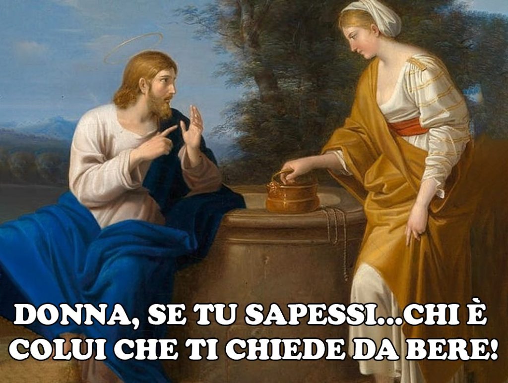 3)- E “quasi mezzogiorno”, un’ora piuttosto insolita, per andare al pozzo, ad attingere acqua. Questa scelta, ci fa capire che la donna, è una “peccatrice”, in quanto, avrà scelto quest’ora di proposito, perché potrebbe sottolineare il desiderio di evitare incontri con altre donne, che solitamente e normalmente, si recavano a prendere l’acqua al mattino presto, nelle ore più fresche della giornata. Questo ci fa comprendere, anche, come Gesù ci conosce bene e vuole dare a tutti- Giusti e Peccatori – la possibilità di ascoltare la sua Parola di Salvezza, che estingue ogni nostra “sete”, con “l’acqua viva” della Fede. Attraverso il dialogo, Gesù, rivela, poi, alla donna, la propria identità “messianica”, e nel contempo le rivela che Dio va adorato, più che sulle montagne di Giudea (Monte Sion!), o di Samaria (Monte Garizim!), “in spirito e verità, con un’adesione interiore ed autentica al Padre, realizzata attraverso la sua Persona. Gesù, poi, dà la prova della sua identità di “profeta”, entrando nella vita privata della donna (vv 16-18). È a questo punto che la donna, arriva a riconoscere Gesù “Messia” (v 25), passando, così, da donna “emarginata”, a Testimone: “Venite a vedere…!” (v 29), provocando la conversione dei samaritani. Essi, inizialmente, credono per la testimonianza della donna, ma poi, “direttamente”, per aver udito Gesù, riconoscendolo come “salvatore del mondo” (vv 40-42). Nel mentre la donna va in paese, ecco che arrivano gli Apostoli da Gesù, ed esprimono la loro grande meraviglia, che parlasse con una donna – “Samaritana” per di più” – (v 27). Essi non hanno ancora compreso, che Gesù, cerca “quello che cerca il Padre” (v 23), svelando loro, gradualmente, il segreto della propria esistenza e il senso globale della sua opera nel mondo. I Discepoli saranno così, i “mietitori” degli ultimi tempi. Raccoglieranno quello che è costato pene e sofferenze, a colui che ha seminato. Allusione, agli antichi Profeti, ma soprattutto, a Gesù stesso. Ora, volendo applicare alla nostra vita, il messaggio di oggi, diciamo subito che anche noi, vogliamo incontrare il Signore, con Lui che ci precede, e ci aspetta al “pozzo” della nostra esistenza. Lui pur conoscendoci bene, tuttavia non si meraviglia: né del nostro imbarazzo, né delle nostre fragilità: Vuole solo farci riflettere sulla nostra “Sete”. Ci vuol far capire che tante volte, abbiamo tentato di dissetarci a “Fonti diverse”, che non ci hanno dissetato; O abbiamo mangiato “cibo”, che non ci ha sfamati; O ci siamo fidati di persone, che ci hanno solo deluso. In questa “ricerca”, oggi il Signore vuol farci capire, che stiamo sbagliando, a cercare nei posti sbagliati, o a rivolgerci alle persone sbagliate! Lui è lì, davanti a noi, l’unico che può riempire il nostro vuoto interiore: con il suo Amore, con la sua Parola, e con il suo Spirito. Lui è la risposta, che estingue ogni nostra “Sete”, perché ci fa il Dono più grande: quello della Vita, che non finisce mai. A tutti, rinnovo l’Augurio di un buon Cammino Quaresimale.