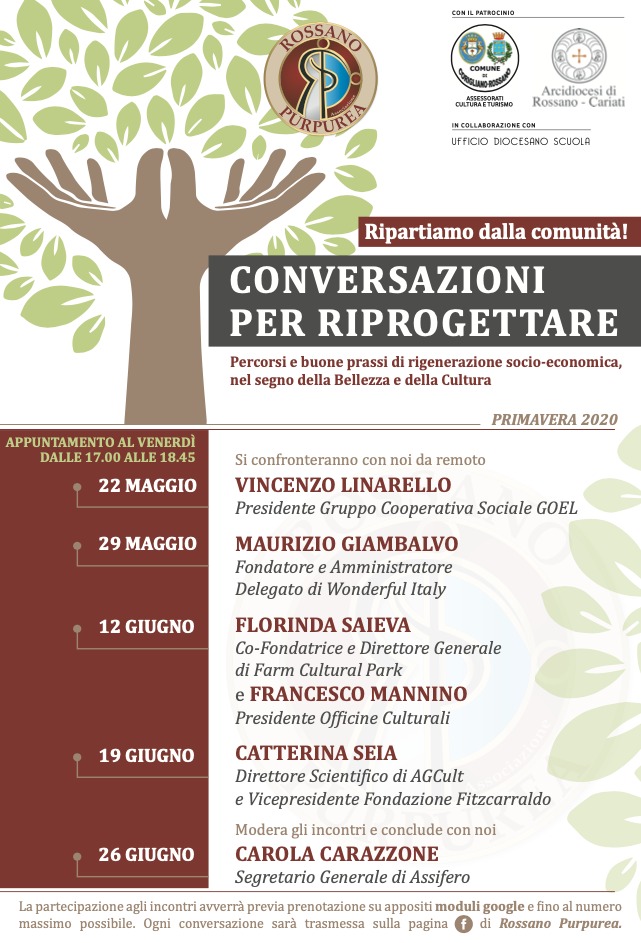 E’ in vista di tutto questo che ROSSANO PURPUREA, CON IL PATROCINIO DEGLI ASSESSORATI ALLA CULTURA E AL TURISMO, E DELL’ARCIDIOCESI DI ROSSANO CARIATI, e in collaborazione con L’UFFICIO DIOCESANO SCUOLA, ha inteso promuovere un’iniziativa di dialogo e crescita comune, un ciclo di incontri da remoto intitolato proprio CONVERSAZIONI PER RIPROGETTARE, attraverso cui conoscere tante storie di coraggio, immaginazione e Bellezza, che, nelle loro realtà, hanno disegnato opportunità nuove e cambi di marcia.