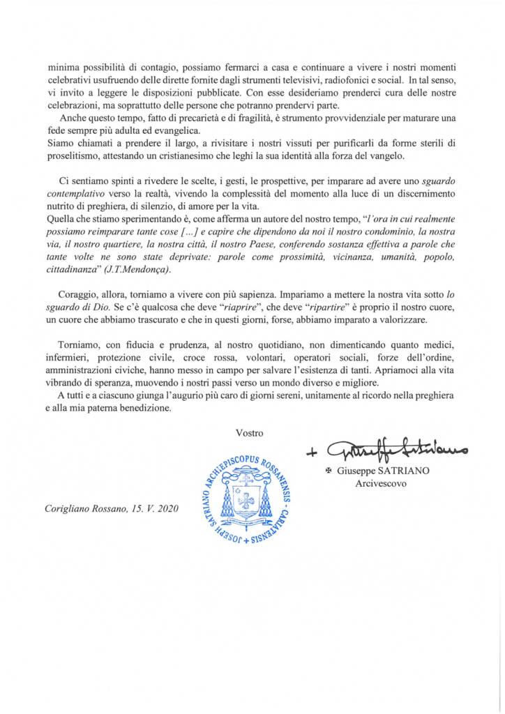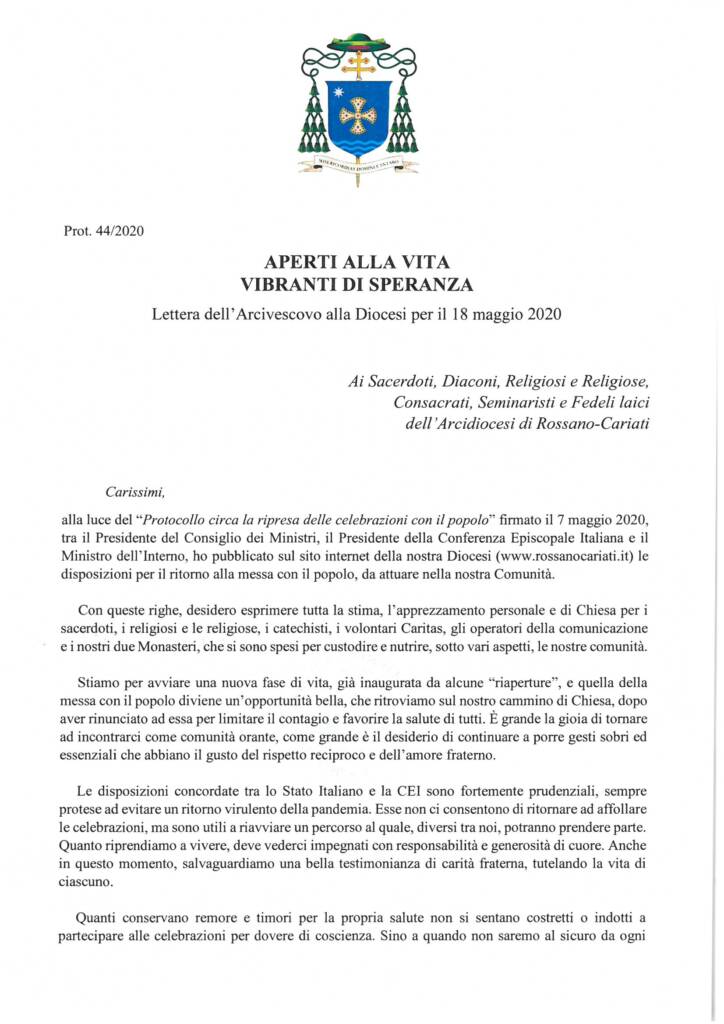 Camminare InsiemeVita PastoraleDisposizioni per le celebrazioni dal 18 maggio 202014 Maggio 202027 Gennaio 2023 Queste le nuove disposizioni per la celebrazione delle Sante Messe, accompagnate da una lettera di S. E. l’Arcivescovo Mons. Giuseppe Satriano ai sacerdoti, le religiose e i fedeli. Disposizioni 18 maggioDownload Aperti alla vita vibranti di speranzaDownload condividi su