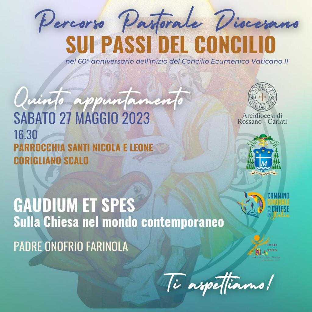 Dopo i proficui appuntamenti già vissuti nelle scorse settimane, si avvia verso la quinta e penultima tappa il Percorso Diocesano “Sui passi del Concilio”, voluto da S. E. l’Arcivescovo Mons. Maurizio Aloise in occasione della celebrazione dei 60 anni dal Concilio Ecumenico Vaticano II. Un percorso che è stato organizzato seguendo lo stile itinerante per toccare più punti del territorio diocesano. Seguendo questa ispirazione il prossimo appuntamento farà tappa nella Vicaria di Corigliano sabato 27 maggio alle ore 16.30, nella la Parrocchia dei Ss. Leone e Nicola allo scalo dell’area urbana di Corigliano. L’incontro sarà moderato da don Giuseppe Ruffo, coordinatore del percorso, e vi prenderà parte il Padre Arcivescovo. La tematica che che sarà affrontata in questa nuova tappa riguarda la Costituzione pastorale sulla Chiesa nel mondo contemporaneo “Gaudium et Spes”. A relazionare sul tema sarà Padre Onofrio Farinola, cultore di Pastorale del Creato ed Ecologia Integrale, che ha conseguito il Dottorato in Teologia Pastorale presso la Pontificia Università Teologica dell’Italia Meridionale di Napoli. Diverse le pubblicazioni da lui curate, a carattere spirituale e teologico. Attualmente svolge il suo ministero pastorale nella Parrocchia S. Maria Assunta in Bocchigliero ed è membro del Tavolo di Studi del Creato della CEI e del gruppo culturale EcoOne del Movimento dei Focolarini, nonché del tavolo di studio dei ricercatori scientifici degli scritti del magistero di don Tonino Bello.