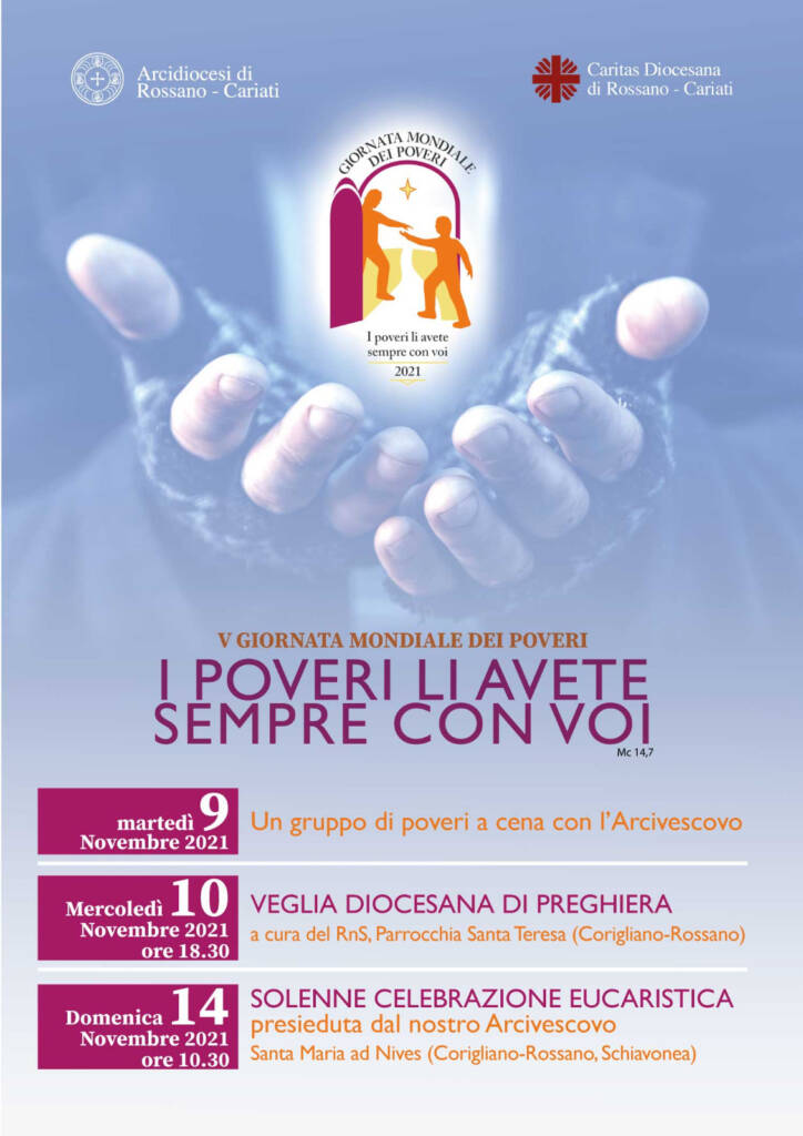 Facendo proprie le parole di Papa Francesco la Arcidiocesi di Rossano Cariati si appresta a vivere la Giornata Mondiale dei Poveri con diversi appuntamenti organizzati dalla equipe della Caritas Diocesana e  “Casa della Speranza” guidata da don Claudio Cipolla.  “Anche il nostro Arcivescovo, ha fatto presente don Claudio, sprona ognuno di noi a vivere con il cuore questa giornata, ogni battezzato è chiamato a vivere il Vangelo ponendo al centro della vita cristiana i poveri, amandoli con la stessa carità di Cristo. Auguriamo a ciascuno di voi di vivere non solo questa giornata, ma tutti i giorni con lo sguardo rivolto ai bisognosi”. Questi gli appuntamenti: Martedì 9 novembre un gruppo di persone bisognose sarà accolto in Episcopio e cenerà con S. E. l’Arcivescovo Mons. Maurizio Aloise; mercoledì 10 novembre alle 18:30 veglia di preghiera diocesana a cura del Rinnovamento dello Spirito Santo nella parrocchia di Santa Teresa di Gesù Bambino nell’area urbana di Rossano; domenica 14 novembre alle 10:30 solenne Celebrazione Eucaristica presieduta dall’Arcivescovo Mons. Maurizio Aloise nella chiesa di Santa Maria ad Nives a Schiavonea nell’area urbana di Corigliano.