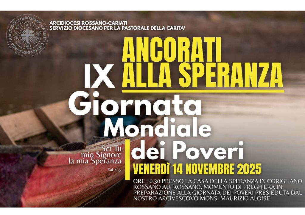 Si celebra domenica 16 novembre la IX Giornata Mondiale dei Poveri. Il Santo Padre ha scelto un motto particolarmente significativo in quest’anno del Giubileo Ordinario del 2025: “Sei tu, mio Signore, la mia speranza” (Sal 71,5). In preparazione all’appuntamento l’Arcidiocesi di Rossano Cariati – Servizio Diocesano per la Pastorale per la Carità, ha organizzato una serie di appuntamenti di accompagnamento alla giornata. Giovedì 13 novembre, ogni parrocchia, è stata invitata ad organizzare e vivere momenti di preghiera, mentre venerdì 14 novembre 2025 alle ore 10:30, nella sede della Casa della Speranza di Corigliano Rossano area urbana Rossano, cuore pulsante da cui si dipana la rete di carità diocesana, si terrà un momento di preghiera in preparazione alla giornata dei poveri presieduta da S. E. l’Arcivescovo Mons. Maurizio Aloise. Domenica 16 novembre, invece, un gruppo della Caritas diocesana sarà presente a Roma per il Giubileo dei poveri, con visita, nei giorni successivi, ad alcune opere segno della Caritas italiana.