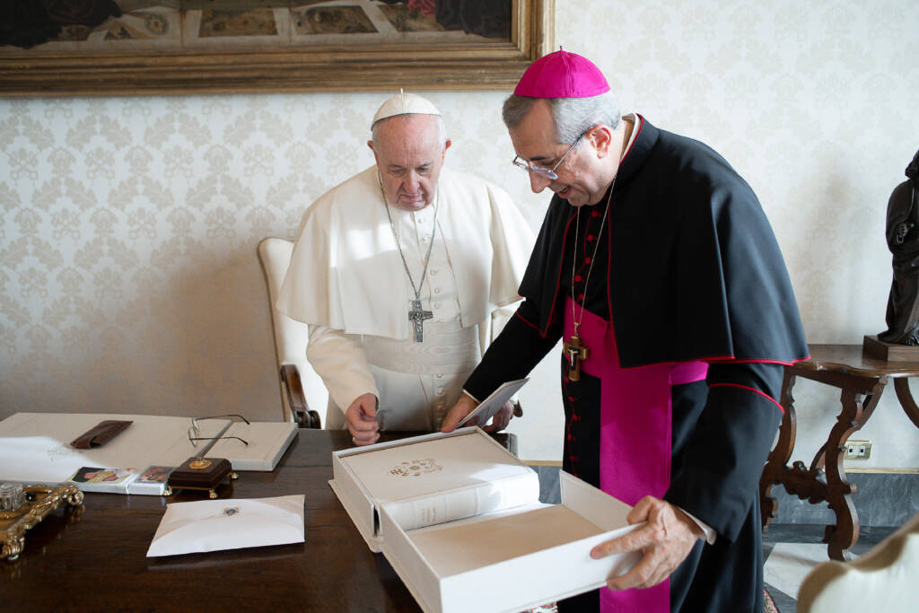 Papa Francesco ha manifestato apprezzamento e gratitudine per i doni che la delegazione dell’Arcidiocesi di Rossano Cariati, guidata da Mons. Giuseppe Satriano, oggi Arcivescovo eletto di Bari Bitonto, ha presentato in occasione dell’udienza del 5 dicembre scorso. Tra questi vi era la copia facsimilare del Codex Purpureus Rossanensis realizzata della Franco Cosimo Panini Editore contrassegnata ad personam per il Papa. E’ stato l’Arcivescovo, nel corso dell’incontro privato, a illustrare al Santo Padre il prezioso evangelario, dichiarato dall’Unesco patrimonio dell’umanità e inserito nella lista Memory of the World. Il Codex ha suscitato lo sguardo attento di Papa Francesco, che si è dimostrato ricco di stupore per ogni pagina sfogliata. La presentazione del prodotto tipico del territorio diocesano, le clementine, è stata occasione per significare all’attenzione del Santo Padre il duro lavoro di tanti uomini e donne della nostra terra, ma anche il segno della sofferenza di donne e uomini maltrattati dal fenomeno del caporalato e da una ingiusta retribuzione, temi denunciati dalla nostra Chiesa e cari al cuore del Papa. A suggello della visita, la delegazione diocesana ha voluto offrire in dono una raffigurazione dell’icona di Maria Santissima Achiropita, la Odegitria protettrice della Arcidiocesi di Rossano Cariati e riferimento identitario della fede del suo popolo. Al rientro in diocesi l’Arcivescovo ha evidenziato il tono cordiale e fraterno con cui si è svolto l’incontro nel quale il Santo Padre ha prestato grande attenzione verso i temi riguardanti la Calabria e la diocesi jonica. “E’ stato confortante” – ha affermato il Presule – “avvertire la vicinanza del cuore che Papa Francesco ha manifestato riguardo alla narrazione della storia della nostra Arcidiocesi e dei suoi vissuti pastorali con i quali si desidera crescere nella fede e nell’impegno a favore dei più deboli e bisognosi”. “Questa visita” – ha aggiunto Mons. Satriano – “è per tutti noi punto di arrivo e di ripartenza nell’assumere la responsabilità di un cammino ecclesiale, attento alle sfide di questo tempo, capace di inclusione e di accompagnamento, per attestare, nel nome di Gesù, una speranza incarnata e autentica”.