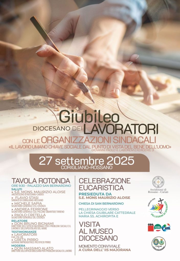 Si terrà sabato 27 settembre 2025 il Giubileo Diocesano dei Lavoratori. Un evento organizzato dall’Arcidiocesi di Rossano-Cariati, in collaborazione con le organizzazioni sindacali della Cgil, Cisl e Uil, con il patrocinio del Comune di Corigliano Rossano.