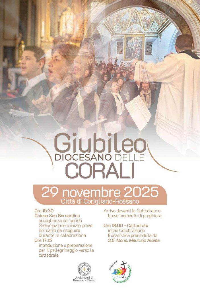 Sabato 29 novembre 2025, con grande gioia, vi invitiamo a partecipare al Giubileo diocesano delle corali, un evento che riunirà le voci dei cori parrocchiali per una solenne celebrazione di fede e comunione. L’appuntamento si terrà a partire dalle 15:30 con un primo momento di accoglienza nella Chiesa di San Bernardino da cui prenderà avvio il pellegrinaggio verso la Cattedrale di Maria Santissima Achiropita dove, dopo un breve momento di preghiera, alle 18:00, si terrà la celebrazione eucaristica presieduta da S. E l’Arcivescovo Mons. Maurizio Aloise. L’incontro sarà un’occasione speciale per manifestare la bellezza del canto corale come espressione della nostra preghiera comunitaria.