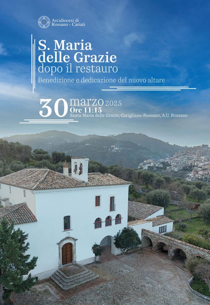 Dopo alcuni anni di intenso e laborioso lavoro di restauro, sarà riaperta al culto, domenica 30 marzo 2025, alle ore 11:15, con una solenne celebrazione liturgica presieduta da S. E. l’Arcivescovo Mons. Maurizio Aloise, l’antica e suggestiva chiesa di Santa Maria delle Grazie che si erge tra le colline dell’area urbana di Rossano. In questa occasione si terrà la benedizione e dedicazione del nuovo altare