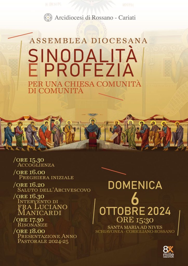 È fissata per domenica 6 ottobre 2024, alle ore 15:30, nella parrocchia di Santa Maria ad Nives di Schiavonea in Corigliano Rossano, l’Assemblea Diocesana dell’Arcidiocesi di Rossano Cariati. Il tema su cui sarà centrato l’importante momento pastorale è “Sinodalità e profezia. Per una chiesa comunità di comunità”. Dopo il momento di accoglienza, alle ore 16:00 si terrà la preghiera iniziale e alle 16:20 il saluto di S. E. l’Arcivescovo di Rossano Cariati Mons. Maurizio Aloise. Alle 16:30 è previsto l’intervento di fra Luciano Manicardi, biblista della comunità monastica di Bose di cui è stato Priore dal 2017 al 2022. Alle ore 17:30 spazio per le risonanze e alle ore 18:00 presentazione dell’Anno Pastorale 2024-2025.