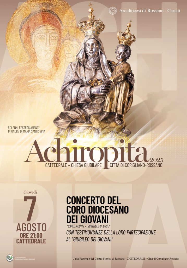 Si terrà giovedì 7 agosto 2025 alle ore 21:00 nella Cattedrale – Chiesa Giubilare di Maria Santissima Achiropita, nel centro storico di Rossano, il Concerto – Testimonianza dei giovani dell’Arcidiocesi di Rossano Cariati di ritorno dal Giubileo dei Giovani. Un cammino di fede con Maria, fino al cuore della speranza. Un momento di comunione, per condividere la vibrante esperienza vissuta negli intensi giorni di incontro con gli altri giovani, uniti nella preghiera e con la benedizione e le esortazioni di Papa Leone. Il concerto sarà animato dalle voci del Coro Diocesano Giovani “Carlo Acutis – Scintille di luce”. Un appuntamento che si inserisce nel cartellone delle iniziative per i solenni festeggiamenti in onore di Maria Santissima Achiropita e che ci restituisce tutta la bellezza della fede, dell’amore e della testimonianza di giovani che hanno scelto di mettere Dio al centro della loro vita.