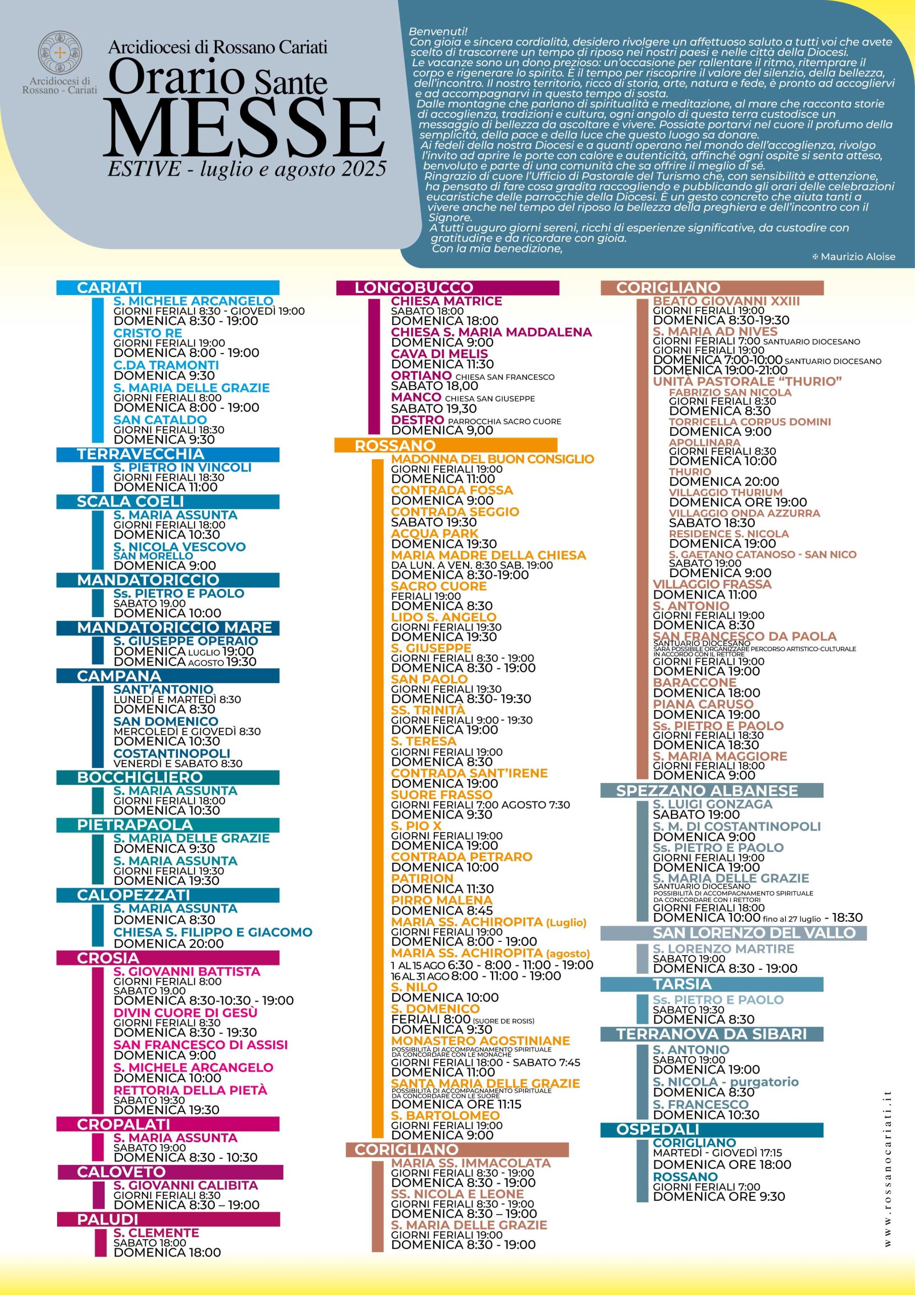Ringrazio di cuore l’Ufficio di Pastorale del Turismo che, con sensibilità e attenzione, ha pensato di fare cosa gradita raccogliendo e pubblicando gli orari delle celebrazioni eucaristiche delle parrocchie della Diocesi. È un gesto concreto che aiuta tanti a vivere anche nel tempo del riposo la bellezza della preghiera e dell’incontro con il Signore.