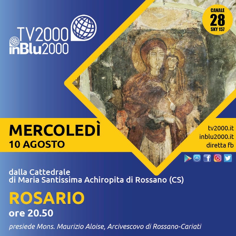 Si invitano i fedeli, le famiglie e le comunità religiose a ritrovarsi, mercoledì 10 agosto alle 20.50, per recitare insieme il Rosario trasmesso su Tv2000 (canale 28 e 157 Sky), InBlu2000, e su Facebook dalla Cattedrale di Maria Santissima Achiropita presieduto dal S. E. l’Arcivescovo Mons. Maurizio Aloise.