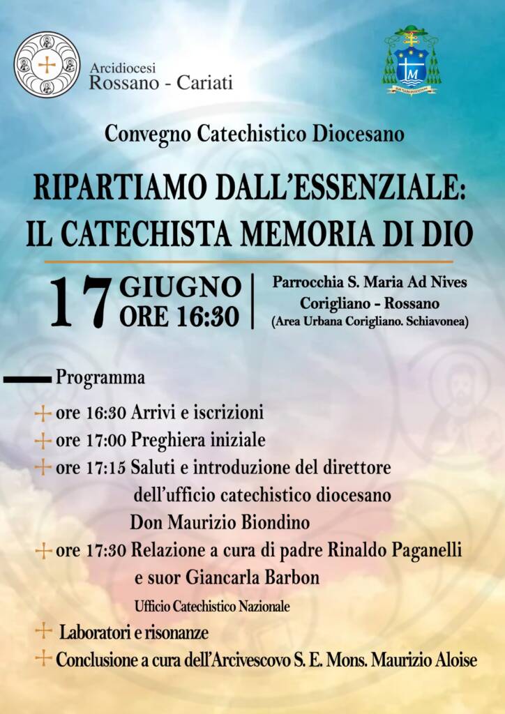 Dopo il fermo delle attività imposto dall’avvento della pandemia riprende il cammino di formazione e confronto dei catechisti. Venerdì 17 giugno si terrà il Convegno Catechistico Diocesano dal titolo evocativo: “Ripartiamo dall’essenziale. Il catechista memoria di Dio”. Sede del convegno diocesano è la chiesa di Santa Maria ad Nives di Schiavonea nell’area urbana di Corigliano. Il programma dei lavori, dopo il momento di accoglienza dei partecipanti, prevede l’introduzione da parte di don Maurizio Biondino Direttore dell’ufficio catechistico diocesano. A seguire le relazioni di padre Riccardo Paganelli e suor Giancarla Barbon dell’Ufficio Catechistico Nazionale. Dopo i laboratori e le risonanze, conclusioni affidate a S. E. l’Arcivescovo Mons. Maurizio Aloise.