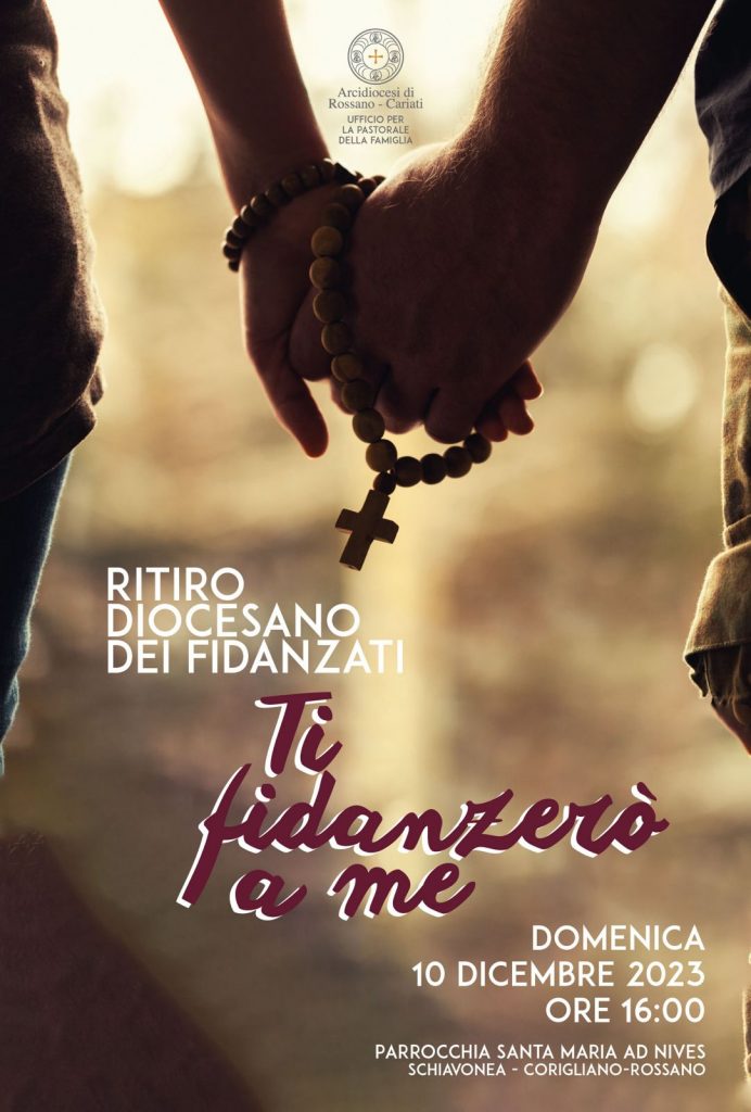 Si terrà domenica 10 dicembre 2023 il ritiro diocesano per i fidanzati. L’appuntamento è organizzato dall’Ufficio per la pastorale della famiglia, diretto da don Gino Esposito, coadiuvato da don Marco Fazio, e i nubendi si ritroveranno alle ore 16 nella parrocchia di Santa Maria ad Nives in località Schiavonea nell’area urbana di Corigliano. La Commissione della Pastorale Diocesana della Famiglia, nel predisporre l’appuntamento, ha scelto come tema del ritiro “Ti fidanzerò a me” che riprende un passo del profeta Osea, in quanto l’unione matrimoniale è un’immagine del legame spirituale che Gesù vuole vivere con noi, per questo aiutati dalle parole del profeta si vivrà questo momento in cui, le coppie di fidanzati che si preparano al matrimonio, saranno i nuovi “artigiani dell’amore”.