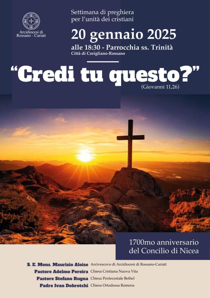 Lunedì 20 gennaio 2025 si celebra la settimana di preghiera per l’unità dei Cristiani. L’ufficio Ecumenismo e Dialogo Interreligioso della Arcidiocesi di Rossano Cariati ha organizzato per le ore 18:30 nella Parrocchia della SS. Trinità nella area urbana di Rossano scalo, la preghiera ecumenica che sarà presieduta da S. E. l’Arcivescovo Mons. Maurizio Aloise. Saranno presenti il pastore Adelmo Pereira della Chiesa Cristiana Nuova Vita, il pastore Stefano Rugna della Chiesa Pentecostale di Bethel e padre Ivan Dobrotchi della Chiesa Ortodossa Romena, con i membri delle loro comunità. Il tema della Settimana si ispira al brano del Vangelo di Giovanni: “Credi tu questo?” (Giovanni 11,26). Il 2025 segna il 1700° anniversario del Primo Concilio Ecumenico di Nicea. Questa commemorazione offre un’occasione unica per riflettere e celebrare la fede comune dei cristiani, così come è stata espressa nel Credo formulato in quel Concilio. La Settimana di preghiera per l’unità dei cristiani 2025 è un invito ad attingere a tale eredità comune e ad approfondire la fede che unisce tutti i cristiani. Per l’occasione il Dicastero per la Promozione dell’Unità dei Cristiani ha messo a disposizione, mediante un libretto che sarà consegnato alle singole parrocchie i testi della Settimana di preghiera per l’unità dei cristiani. Le preghiere e le riflessioni sono state preparate dai fratelli e dalle sorelle della Comunità monastica di Bose. I sussidi preparati offrono uno spaccato della riflessione cristiana dell’epoca e per aiutare a situare le definizioni del Concilio di Nicea nel contesto in cui hanno avuto origine e dal quale sono state influenzate e l’augurio è che la preghiera possa realizzare spazi di unità e di carità fra i cristiani di diverse confessioni.