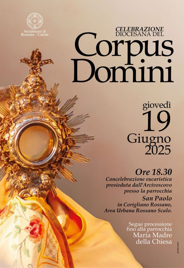Giovedì 19 giugno, l’Arcidiocesi di Rossano-Cariati celebrerà la solennità del Corpus Domini, come è ormai consuetudine, a livello diocesano. L’Arcivescovo, S. E. Mons. Maurizio Aloise, presiederà la Concelebrazione eucaristica alle 18:30 nella parrocchia di San Paolo, nell’area urbana dello Scalo di Rossano. All’evento parteciperanno tutti i sacerdoti, i religiosi, le religiose, le Aggregazioni Laicali, le Confraternite e i laici della Chiesa Diocesana. A conclusione della Celebrazione eucaristica, si avvierà la processione, che percorrerà le strade principali dello Scalo di Rossano e si concluderà con la benedizione eucaristica presso la parrocchia di Maria Madre della Chiesa.