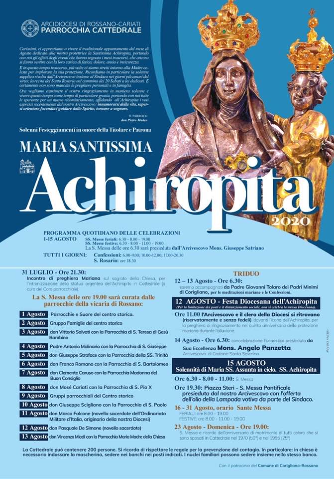 Giorno 12  Agosto, Festa Diocesana dell’Achiropita, per favorire il più possibile la partecipazione dei fedeli alle messe previste, alle ore 11.00, S. E. l’Arcivescovo Mons. Giuseppe Satriano e il clero della Diocesi si ritroveranno, riservatamente e senza fedeli, davanti l’icona dell’Achiropita, per una preghiera di ringraziamento, nel quinto anniversario della protezione mariana durante l’alluvione del 2015.