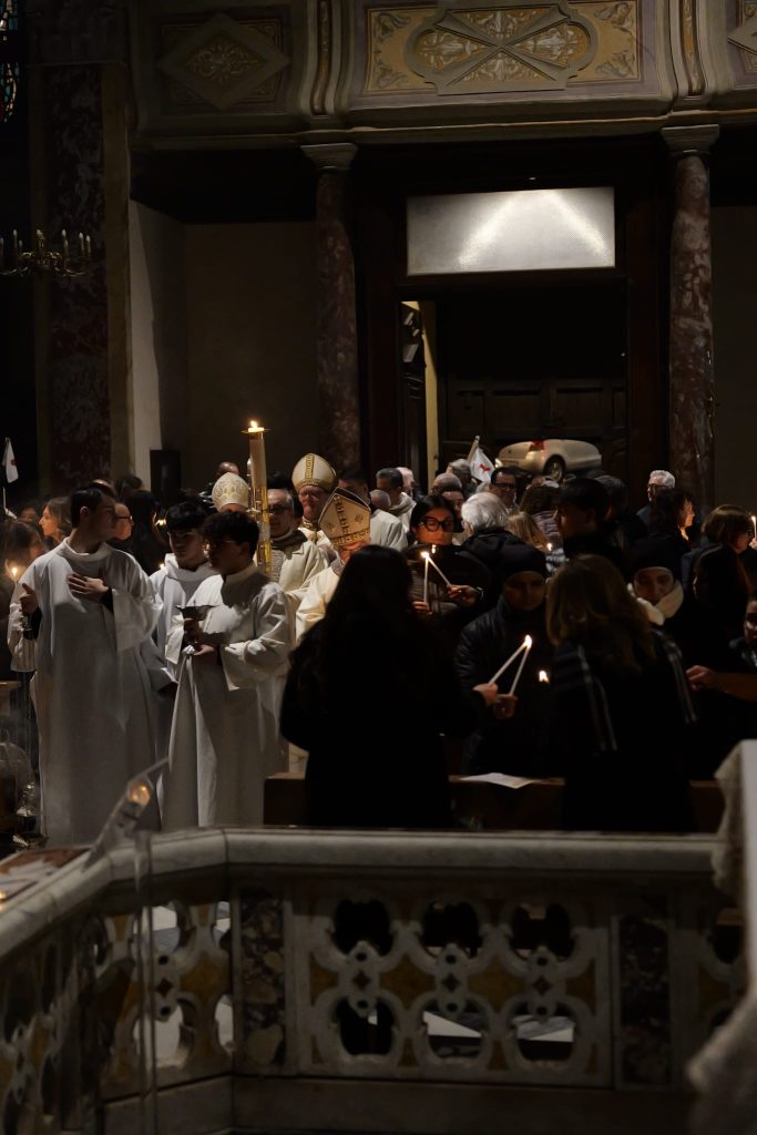 La Veglia, definita dalla tradizione “Madre di tutte le veglie”, ha preso avvio nel buio, con l’accensione del fuoco nuovo e del cero pasquale, segni della luce di Cristo che illumina ogni oscurità. Il cammino liturgico, ricco di simboli e proclamazione della Parola, ha condotto l’assemblea attraverso le grandi tappe della storia della salvezza fino all’annuncio gioioso della Risurrezione.